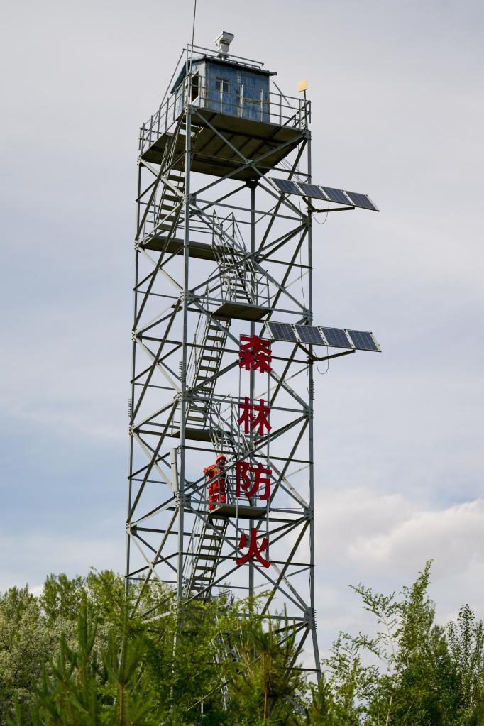6月5日,临河区国营新华林场护林员登上瞭望塔准备开展巡护工作。新华社记者 李志鹏 摄